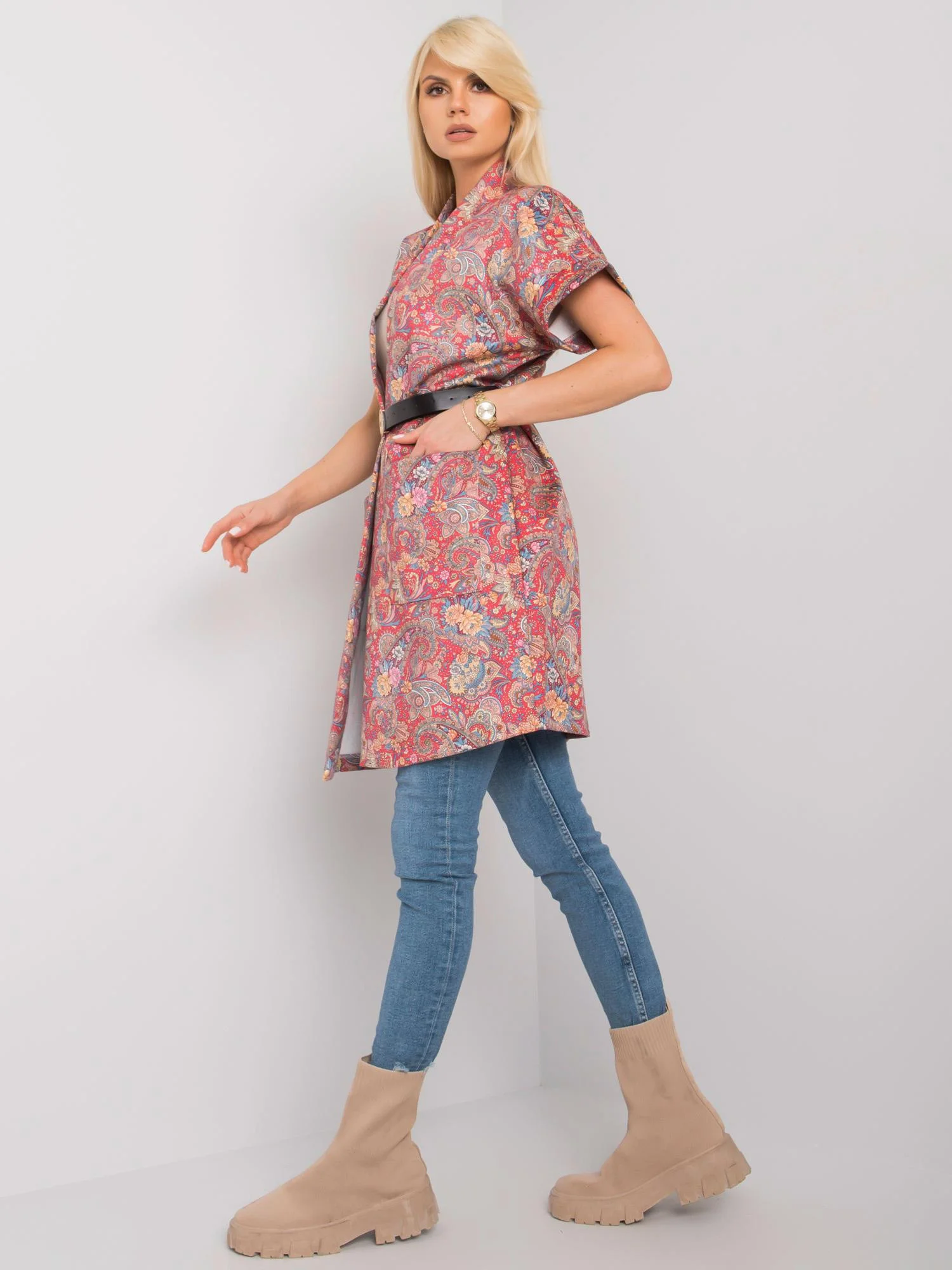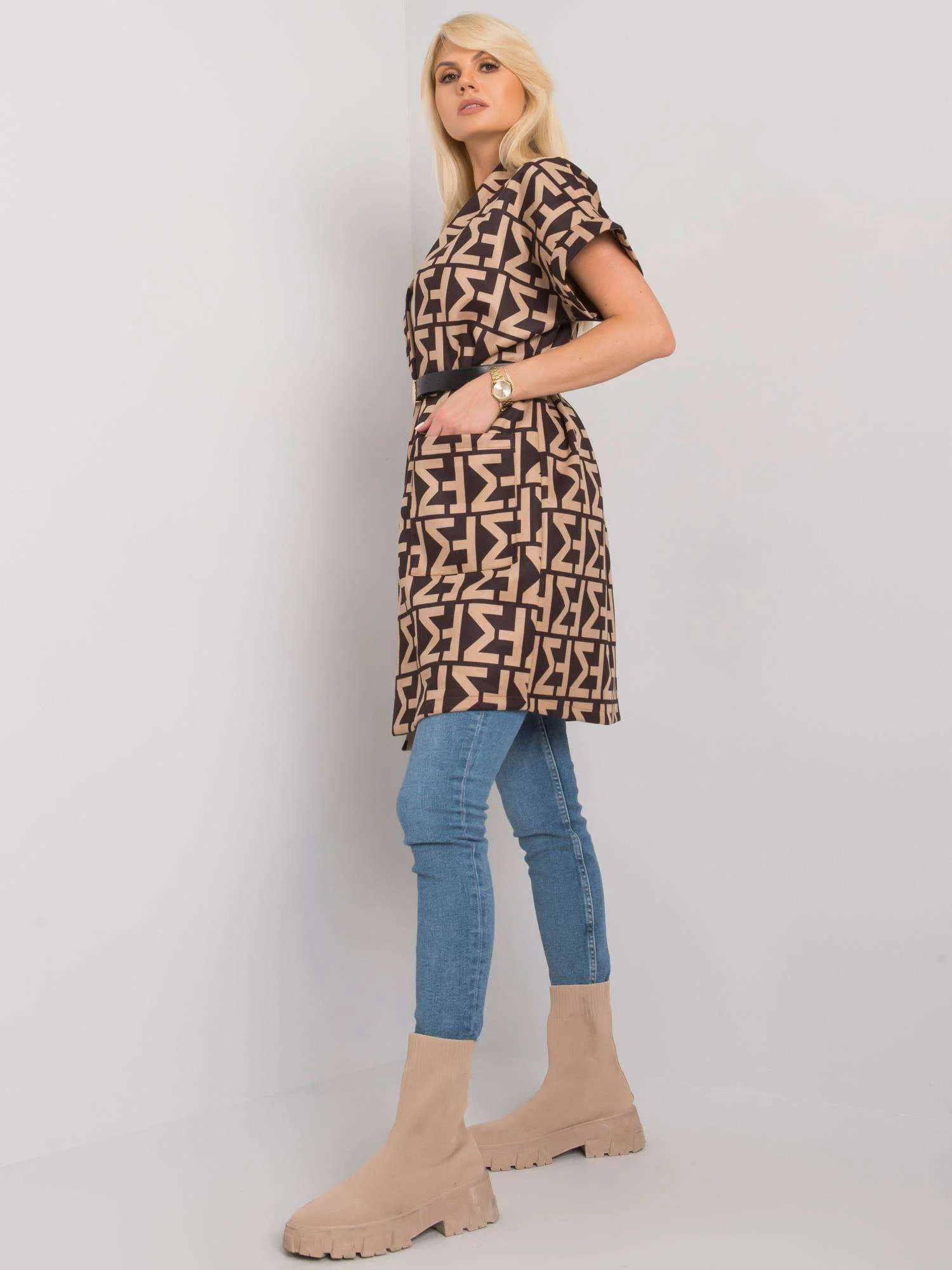 • Modelka na obrázkoch je vysoká 170 cm, obvod cez prsia má 84 cm, obvod pása 64 cm a cez boky 93 cm.