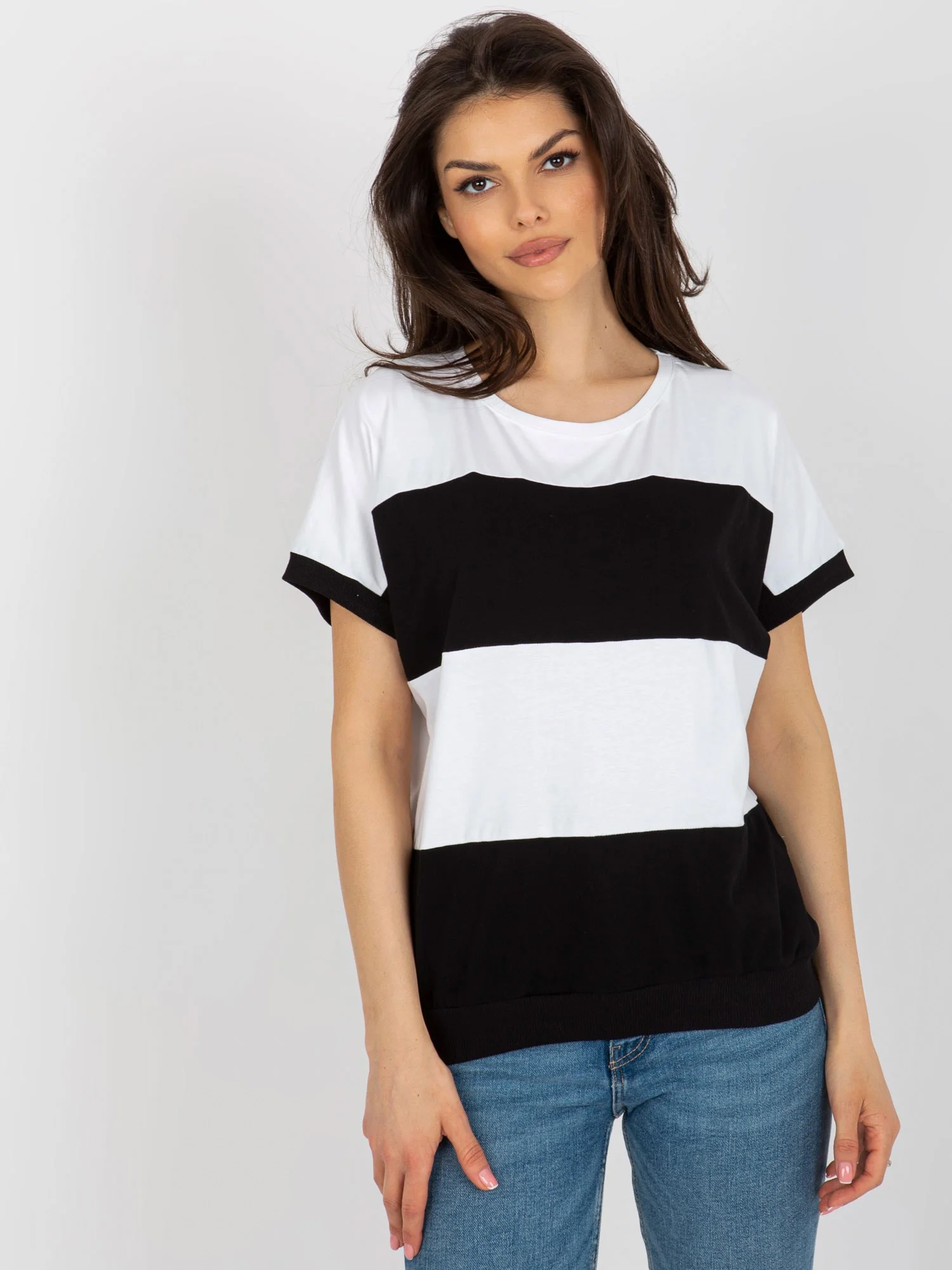 Modelka na obrázkoch je vysoká 172 cm, obvod cez prsia má 103 cm, obvod pása 73 cm a cez boky 103 cm. Modelka je oblečená do veľkosti L/XL. Materiál: 70% bavlna, 30% polyester