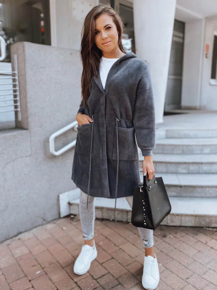 Prezrite si Tmavo šedý chlpatý kardigan s kapucňou melby NY0479 Veľkosť: M v sekcii dámske kardigany a kúpte ho za 77,1 EUR u Londonclub.sk.