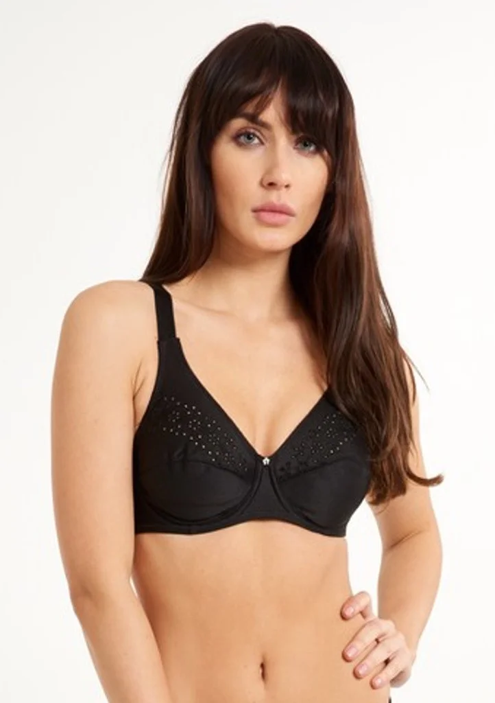 • Čierna podprsenka zafixuje poprsie na strede a vykúzli neodolateľný dekolt. Všité kostice poskytujú potrebnú oporu a nijako neobmedzujú v pohybe. Samozrejmosťou sú pohodlné nastaviteľné ramienka a pevný obvod. Hladké koše sa nerysujú pod oblečením. Skvelá voľba na každodenné nosenie.